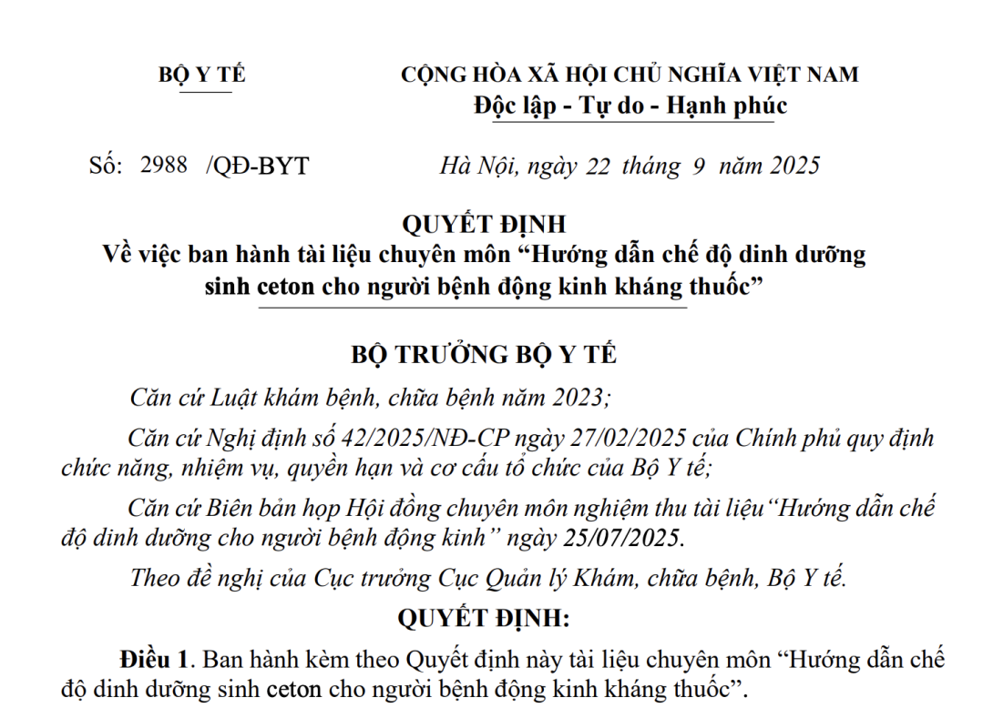 VỀ VIỆC BAN HÀNH TÀI LIỆU CHUYÊN MÔN “HƯỚNG DẪN CHẾ ĐỘ DINH DƯỠNG SINH CETON CHO NGƯỜI BỆNH ĐỘNG KINH KHÁNG THUỐC”