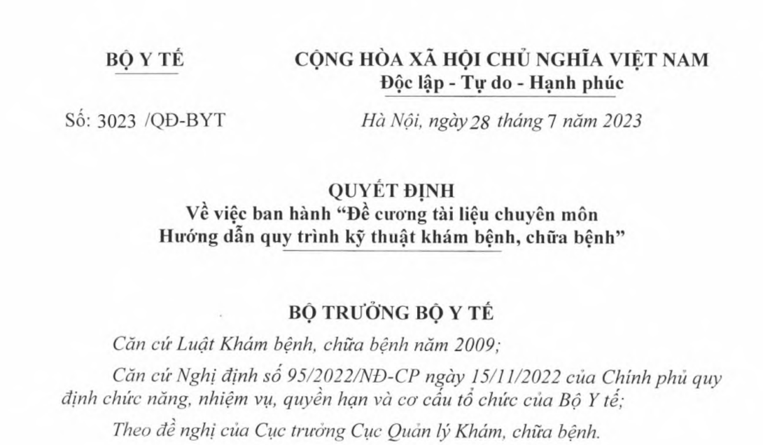 VỀ VIỆC BAN HÀNH “ĐỀ CƯƠNG TÀI LIỆU CHUYÊN MÔN HƯỚNG DẪN QUY TRÌNH KỸ THUẬT KHÁM BỆNH, CHỮA BỆNH”