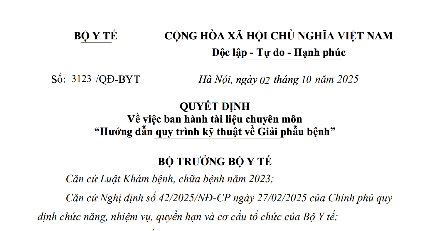 Căn cứ Biên bản họp ngày 08 tháng 08 năm 2025 của Hội đồng chuyên môn nghiệm thu “Hướng dẫn quy trình kỹ thuật về Giải phẫu bệnh”; Công văn số 3270/BVK-KHTH ngày 25 tháng 08 năm 2025 của Bệnh viện K về việc hoàn thiện Hướng dẫn Quy trình chuyên môn kỹ thuật chuyên ngành Giải phẫu bệnh;