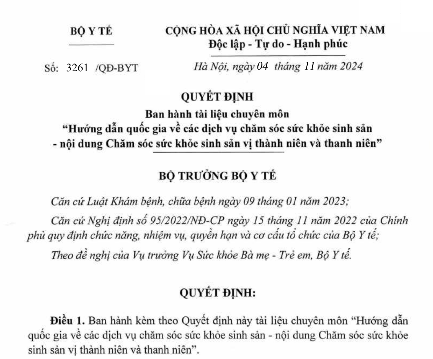 Điều 1. Ban hành kèm theo Quyết định này tài liệu chuyên môn “Hướng dẫn quốc gia về các dịch vụ chăm sóc sức khỏe sinh sản - nội dung Chăm sóc sức khỏe sinh sản vị thành niên và thanh niên”.