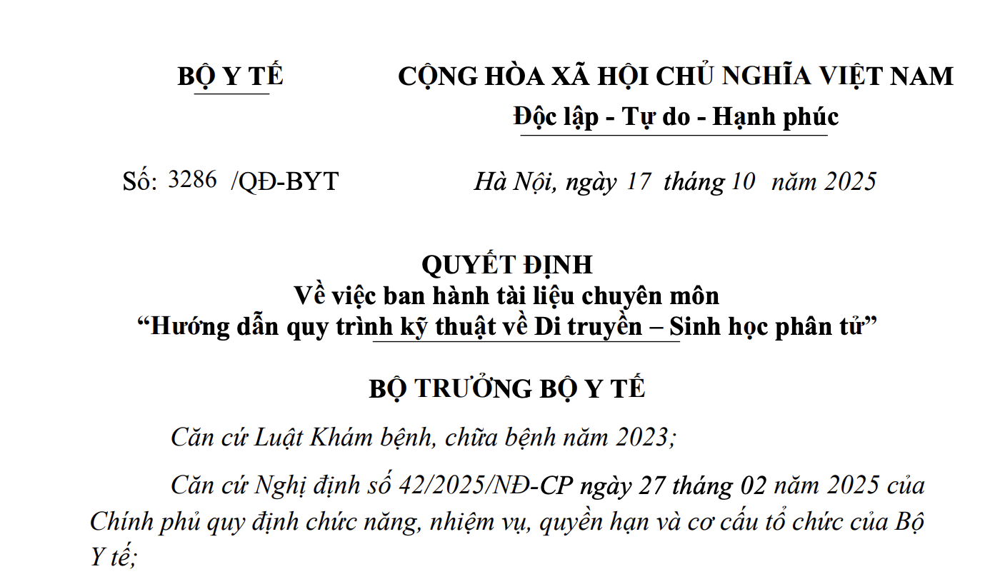 Căn cứ Biên bản họp ngày 08 tháng 08 năm 2025 của Hội đồng chuyên môn nghiệm thu “Hướng dẫn quy trình chuyên môn kỹ thuật về Di truyền - Sinh học phân tử”; Công văn số 1130/HHTM ngày 20 tháng 08 năm 2025 của Viện Huyết học - Truyền máu Trung ương về việc hoàn thiện Hướng dẫn Quy trình chuyên môn kỹ thuật khám bệnh, chữa bệnh;