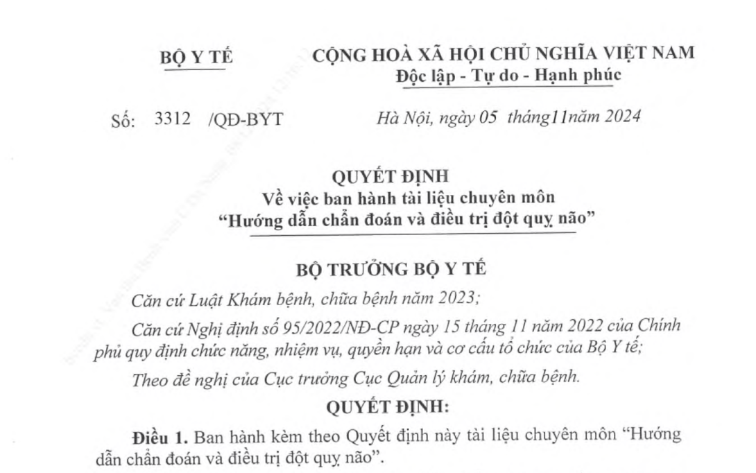 VỀ VIỆC BAN HÀNH TÀI LIỆU CHUYÊN MÔN “HƯỚNG DẪN CHẨN ĐOÁN VÀ ĐIỀU TRỊ ĐỘT QUỴ NÃO”