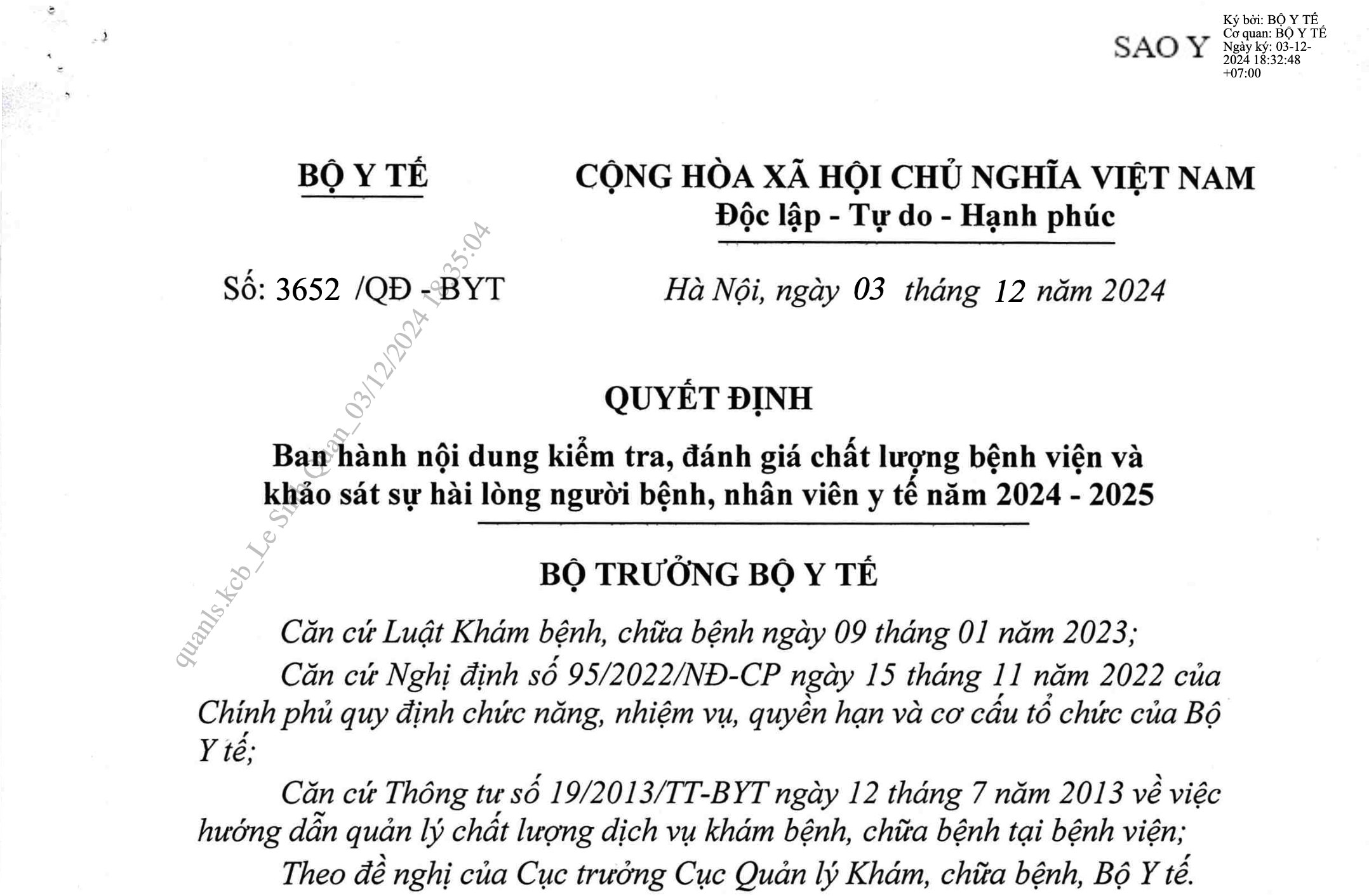 Nơi nhận: - Như Điều 8; - Bộ trưởng (để b/c); - Các Thứ trưởng (để phối hợp chỉ đạo); - Vụ KGVX-VPCP, Vụ XH-VPQH (để b/c); - BHXHVN, Tổng hội YHVN (để p/h); - Các Vụ, Cục, đơn vị thuộc Bộ (để p/h); - CĐYTVN, Báo SKĐS (để p/h); - Cổng TTĐT BYT, Tr. TTĐT Cục QLKCB; - Lưu: VT, KCB. | KT. BỘ TRƯỞNG THỨ TRƯỞNG