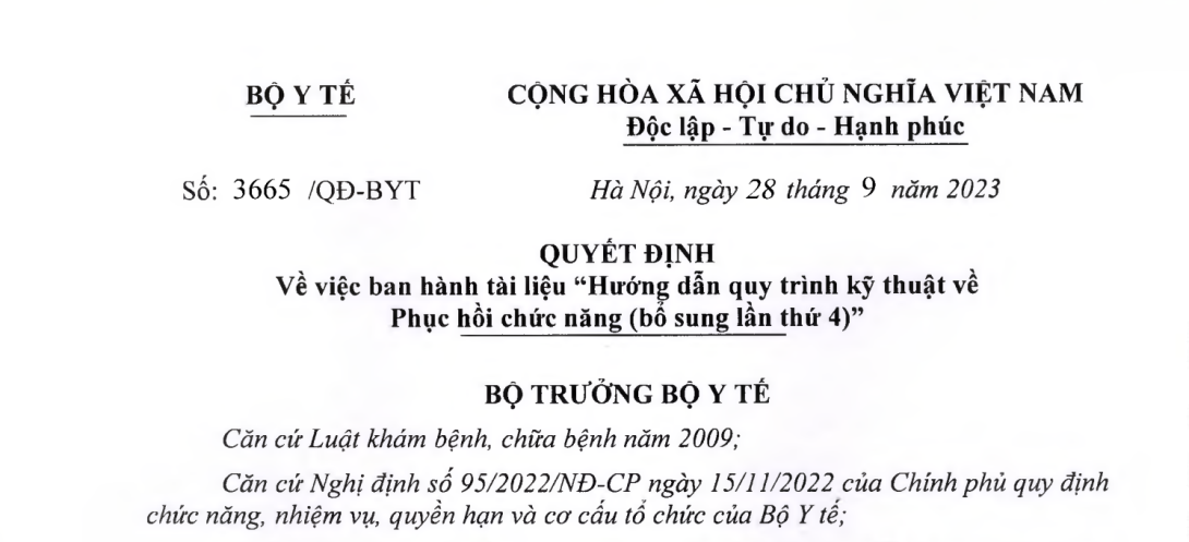 VỀ VIỆC BAN HÀNH TÀI LIỆU “HƯỚNG DẪN QUY TRÌNH KỸ THUẬT VỀ PHỤC HỒI CHỨC NĂNG (BỔ SUNG LẦN THỨ 4)”