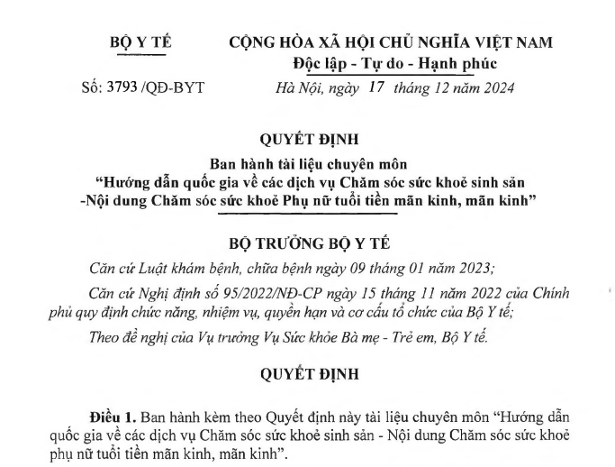 BAN HÀNH TÀI LIỆU CHUYÊN MÔN “HƯỚNG DẪN QUỐC GIA VỀ CÁC DỊCH VỤ CHĂM SÓC SỨC KHỎE SINH SẢN -NỘI DUNG CHĂM SÓC SỨC KHỎE PHỤ NỮ TUỔI TIỀN MÃN KINH, MÃN KINH”