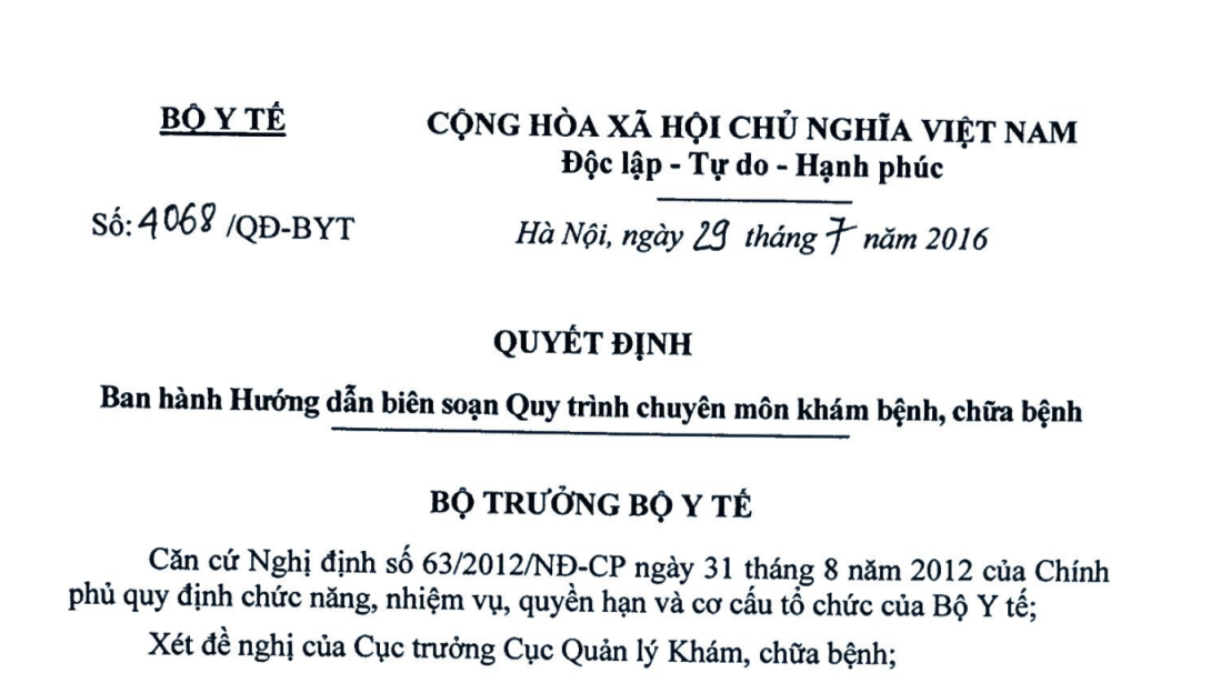 BAN HÀNH HƯỚNG DẪN BIÊN SOẠN QUY TRÌNH CHUYÊN MÔN KHÁM BỆNH, CHỮA BỆNH