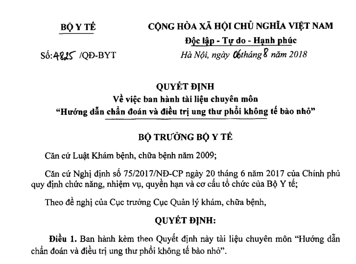 VỀ VIỆC BAN HÀNH TÀI LIỆU CHUYÊN MÔN “HƯỚNG DẪN CHẨN ĐOÁN VÀ ĐIỀU TRỊ UNG THƯ PHỔI KHÔNG TẾ BÀO NHỎ”