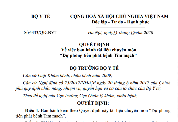 Điều 1. Ban hành kèm theo Quyết định này tài liệu chuyên môn “Dự phòng tiên phát bệnh Tim mạch”.