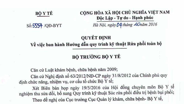 VỀ VIỆC BAN HÀNH HƯỚNG DẪN QUY TRÌNH KỸ THUẬT RỬA PHỔI TOÀN BỘ