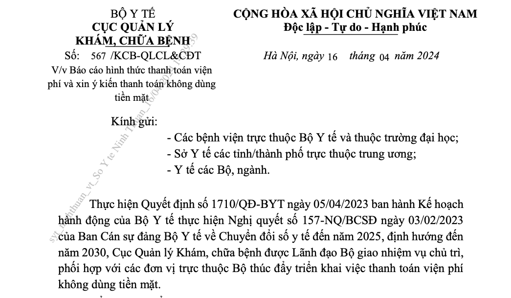 Công văn số 567/KCB-QLCL&CĐT Báo cáo hình thức thanh toán viện phí và xin ý kiến thanh toán không dùng tiền mặt