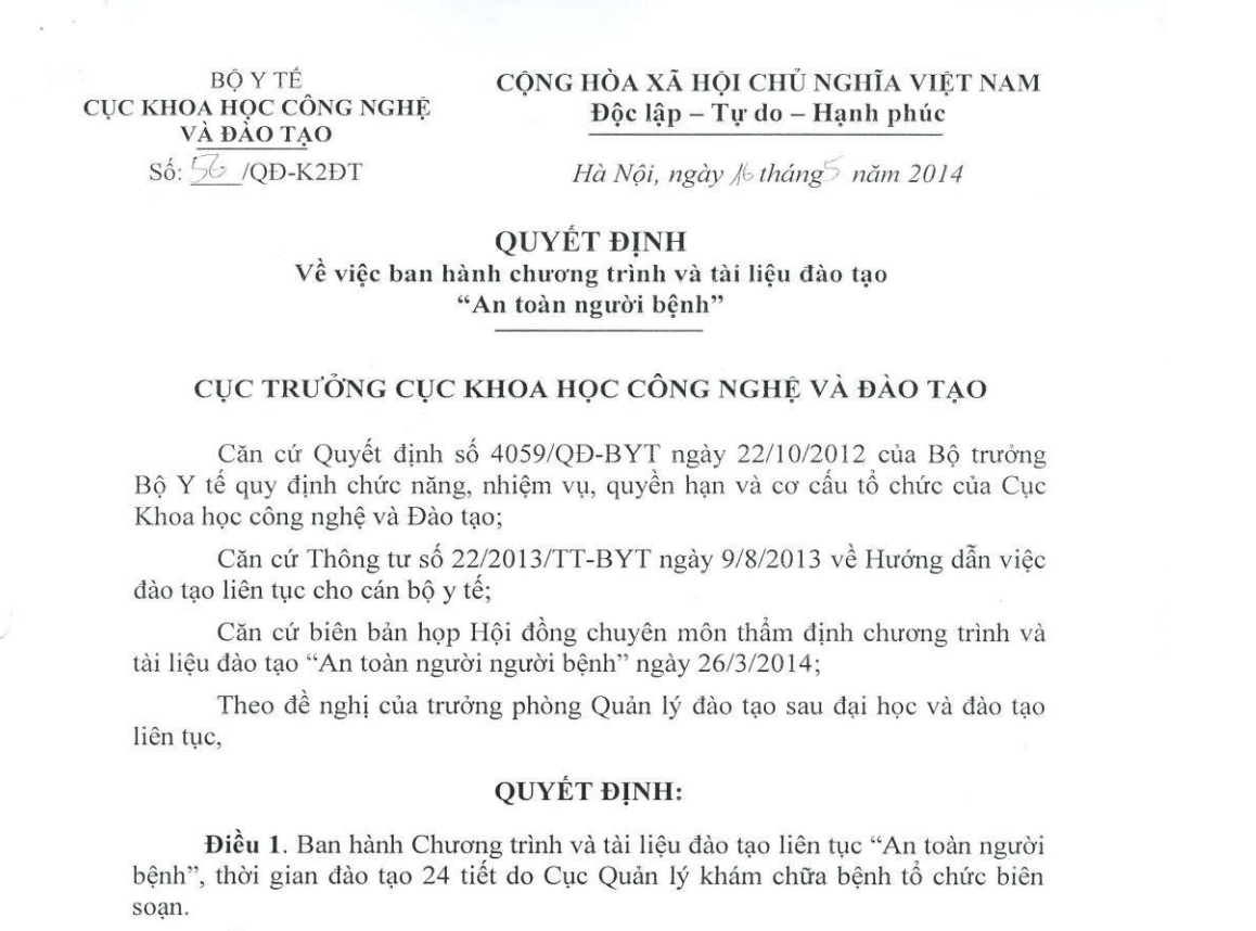 Căn cứ biên bản họp Hội đồng chuyên môn thẩm định chương trình và tài liệu đào tạo “An toàn người người bệnh” ngày 26/3/2014;
