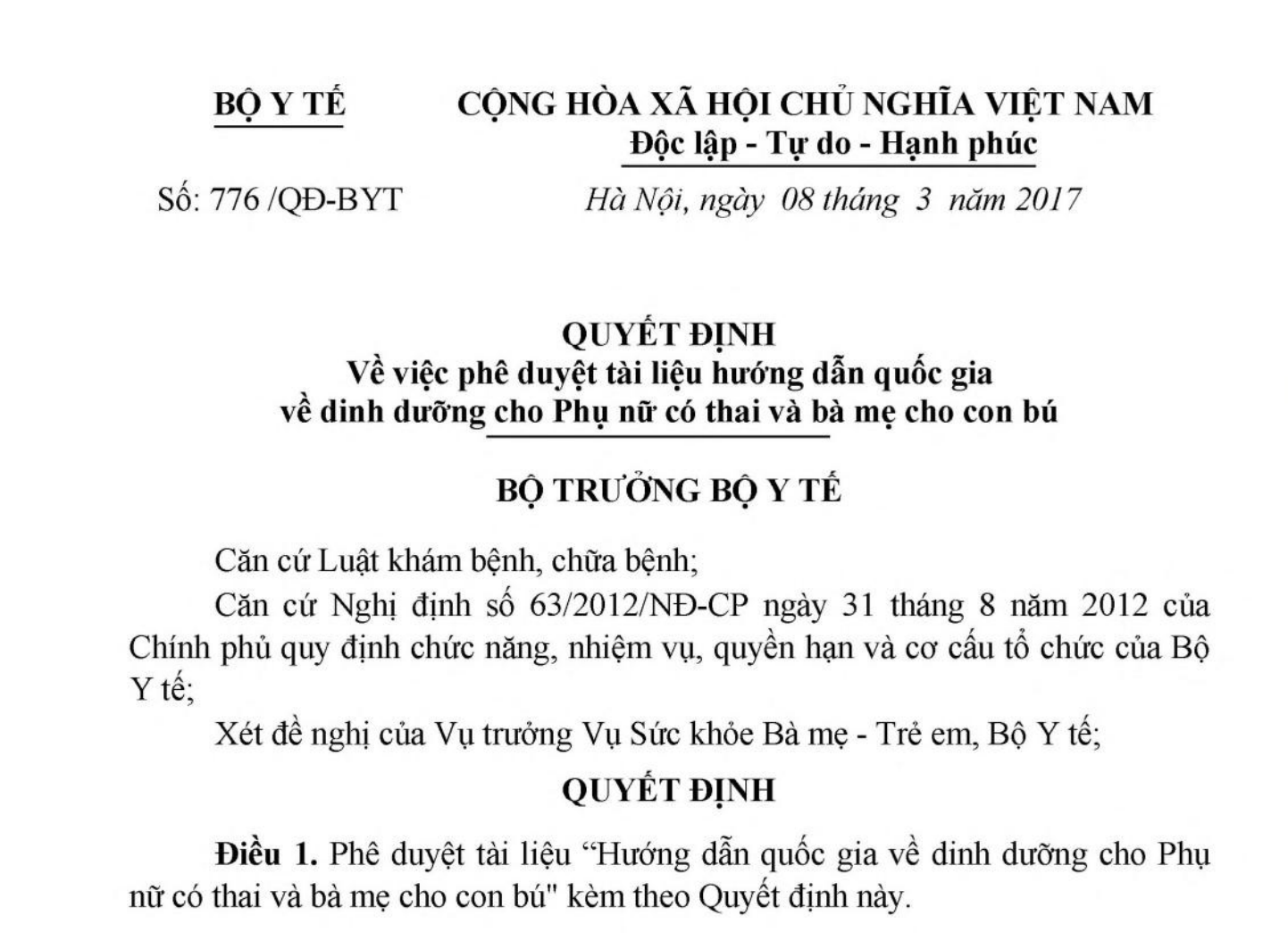 Điều 1. Phê duyệt tài liệu “Hướng dẫn quốc gia về dinh dưỡng cho Phụ nữ có thai và bà mẹ cho con bú" kèm theo Quyết định này.
