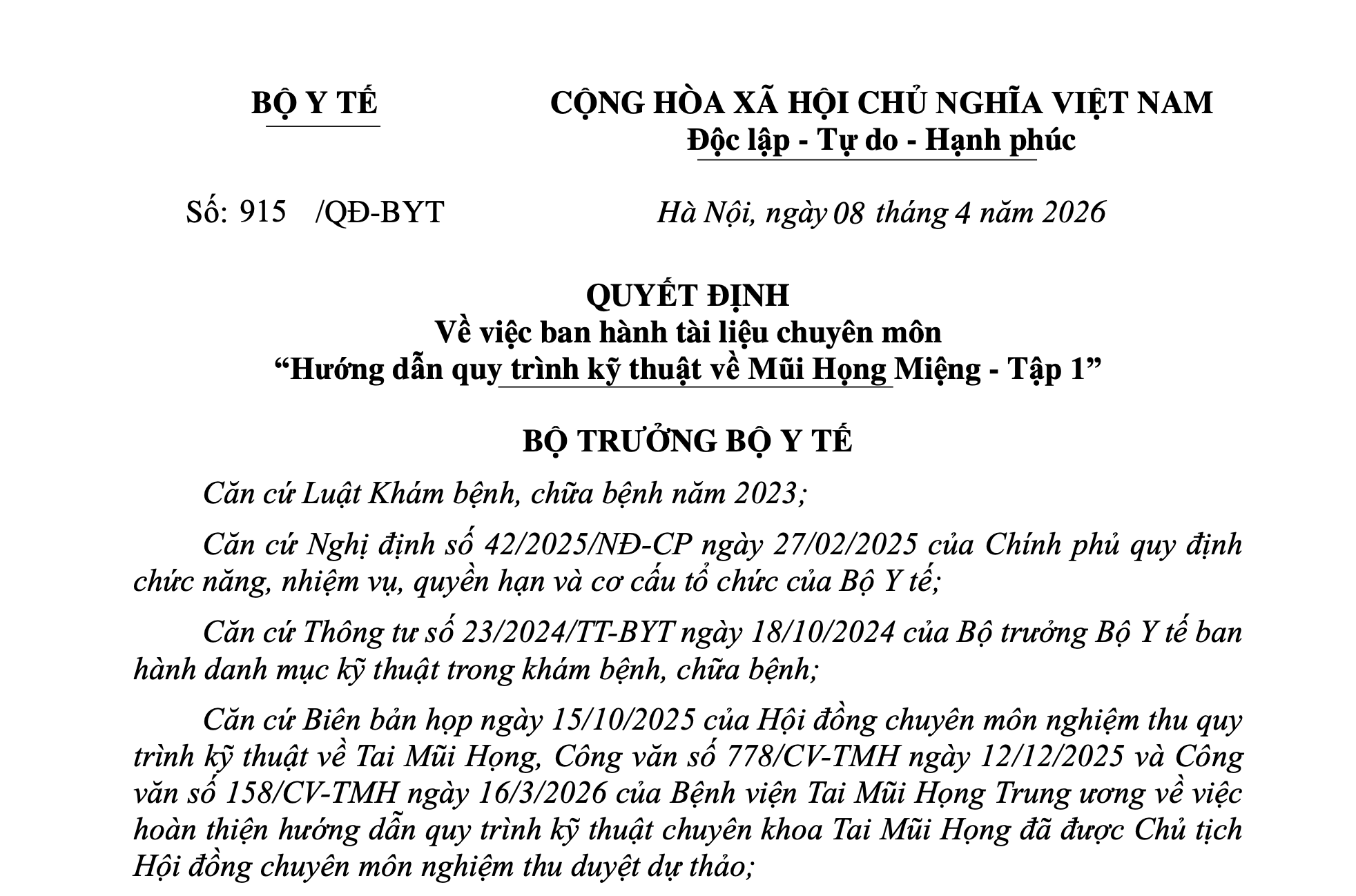 Căn cứ Biên bản họp ngày 15/10/2025 của Hội đồng chuyên môn nghiệm thu quy trình kỹ thuật về Tai Mũi HọngCông văn số 778/CV-TMH ngày 12/12/2025 và Công văn số 158/CV-TMH ngày 16/3/202của Bệnh viện Tai Mũi Họng Trung ương về việc hoàn thiện hướng dẫn quy trình kỹ thuật chuyên khoa Tai Mũi Họng đã được Chủ tịch Hội đồng chuyên môn nghiệm thu duyệt dự thảo;