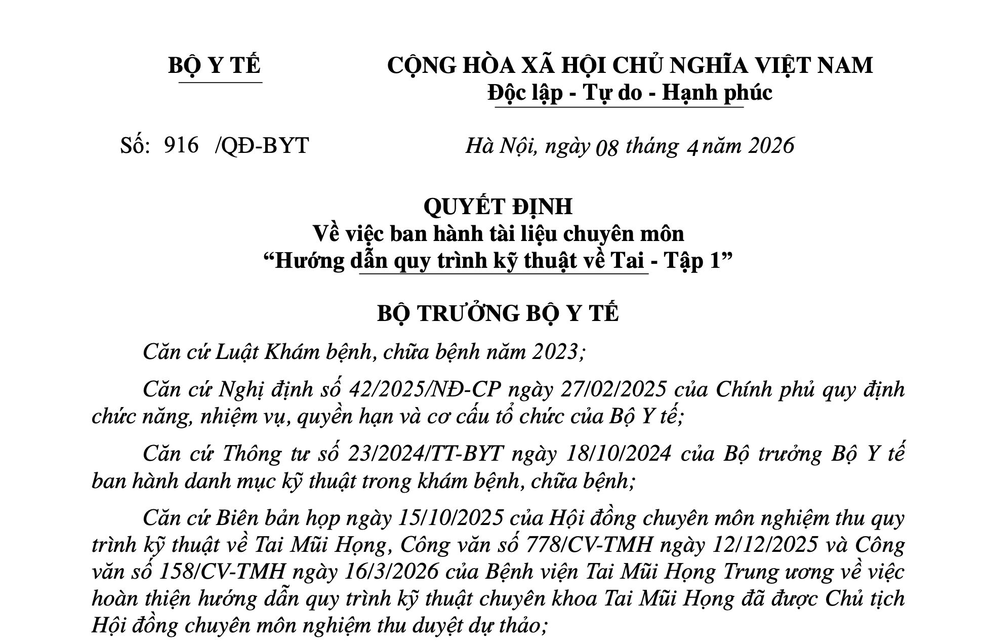 Căn cứ Biên bản họp ngày 15/10/2025 của Hội đồng chuyên môn nghiệm thu quy trình kỹ thuật về Tai Mũi Họng, Công văn số 778/CV-TMH ngày 12/12/2025 và Công văn số 158/CV-TMH ngày 16/3/2026 của Bệnh viện Tai Mũi Họng Trung ương về việc hoàn thiện hướng dẫn quy trình kỹ thuật chuyên khoa Tai Mũi Họng đã được Chủ tịch Hội đồng chuyên môn nghiệm thu duyệt dự thảo;