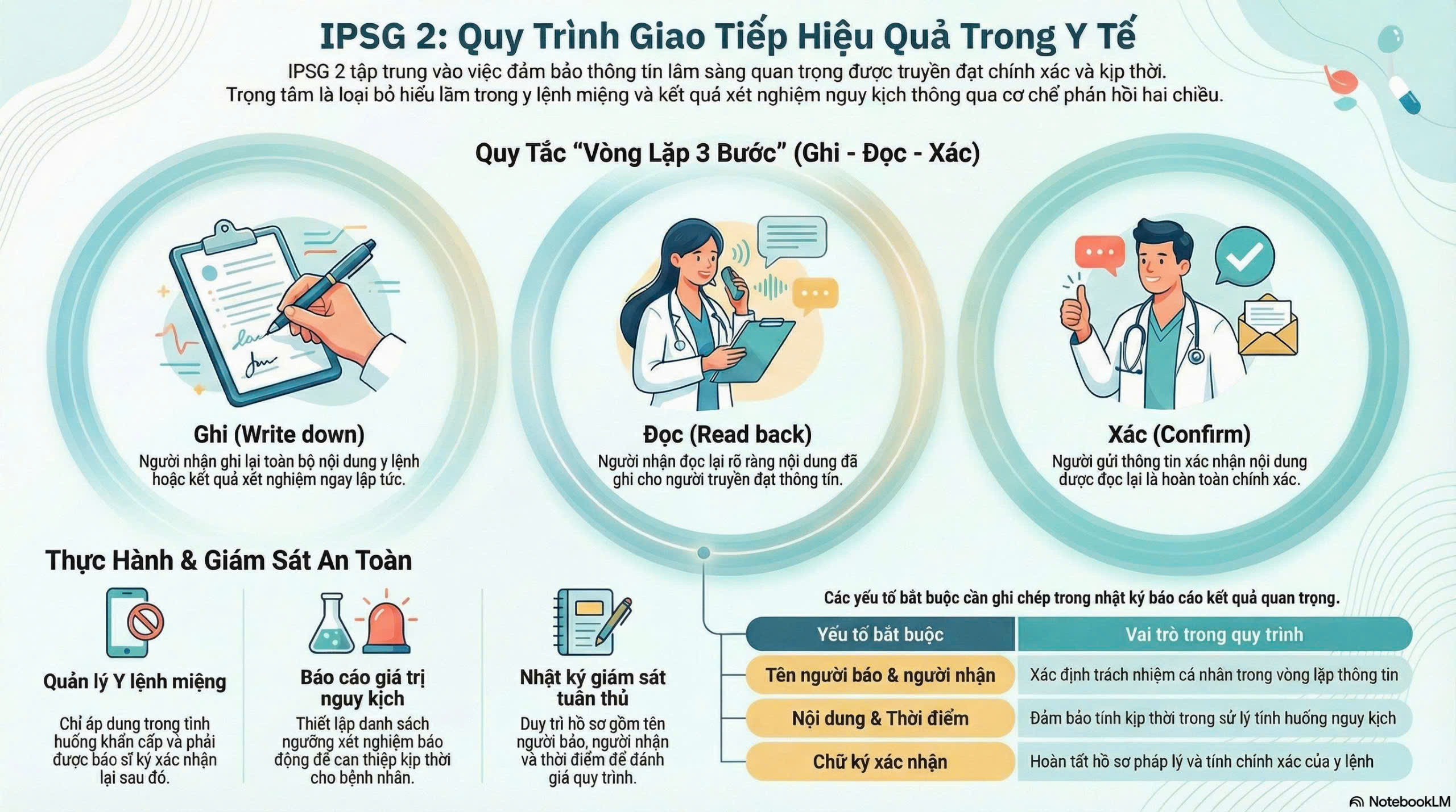 1. Tóm lược (Cốt lõi) Mục tiêu IPSG 2 tập trung vào việc đảm bảo các thông tin lâm sàng quan trọng — bao gồm y lệnh miệng, lệnh qua điện thoại, kết quả xét nghiệm nguy kịch, và thông tin bàn giao ca — được truyền đạt một cách chính xác và kịp thời. Mục đích tối thượng là loại bỏ hoàn toàn các sai sót do nghe nhầm, hiểu lầm hoặc xử lý chậm trễ trong các tình huống đe dọa tính mạng.