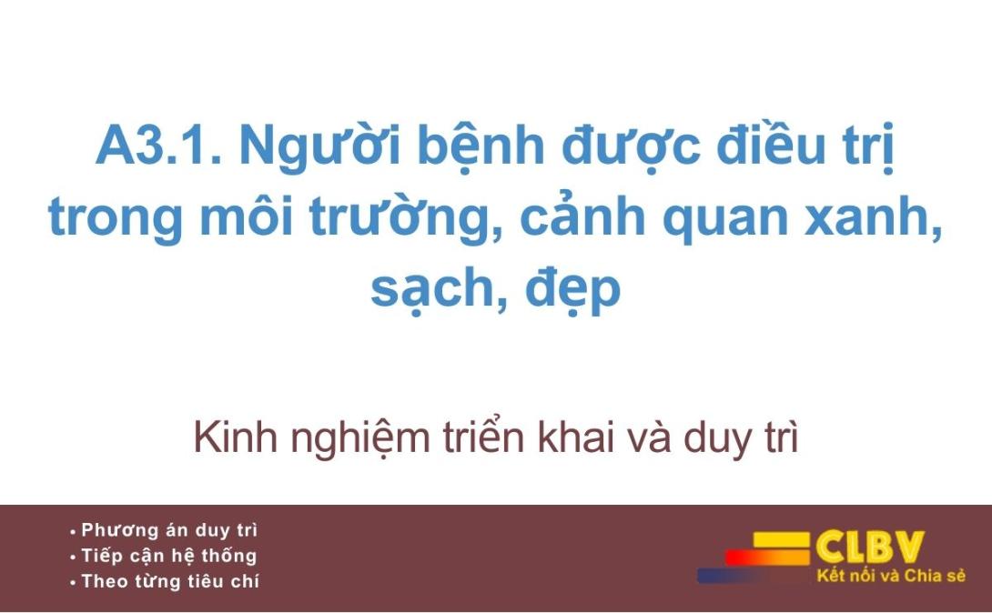 Tiêu chí A3.1 không đơn thuần là tiêu chí về cảnh quan hay mỹ quan bệnh viện, mà là tiêu chí phản ánh cách bệnh viện nhìn nhận môi trường điều trị như một thành phần của chất lượng chăm sóc người bệnh.
