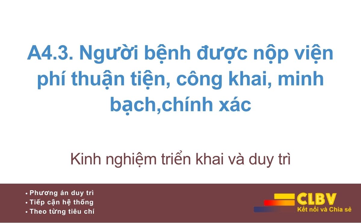 Tiêu chí A4.3 không chỉ đánh giá bệnh viện có quầy thu viện phí hay phần mềm thanh toán, mà đánh giá mức độ bệnh viện bảo đảm quyền tài chính của người bệnh thông qua quy trình thu – thanh toán rõ ràng, dễ hiểu và đáng tin cậy.