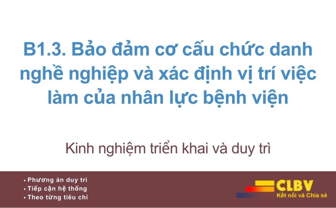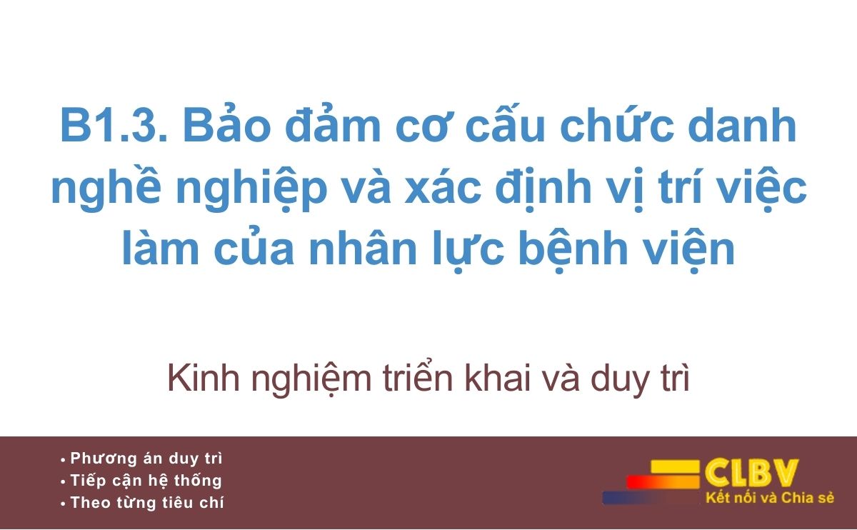 Tiêu chí B1.3 không chỉ yêu cầu bệnh viện có đủ các chức danh nghề nghiệp theo quy định, mà yêu cầu bệnh viện xây dựng được cơ cấu nhân lực hợp lý và xác định rõ vị trí việc làm để mỗi nhân viên được bố trí, sử dụng đúng vai trò và năng lực.