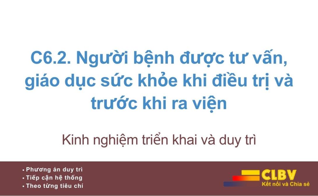Tiêu chí C6.2 không yêu cầu bệnh viện phải “tổ chức nhiều buổi truyền thông” hay “phát nhiều tờ rơi cho người bệnh”, mà yêu cầu bảo đảm người bệnh và người chăm sóc được cung cấp đầy đủ thông tin cần thiết để hiểu, phối hợp điều trị và tự chăm sóc an toàn sau khi ra viện.