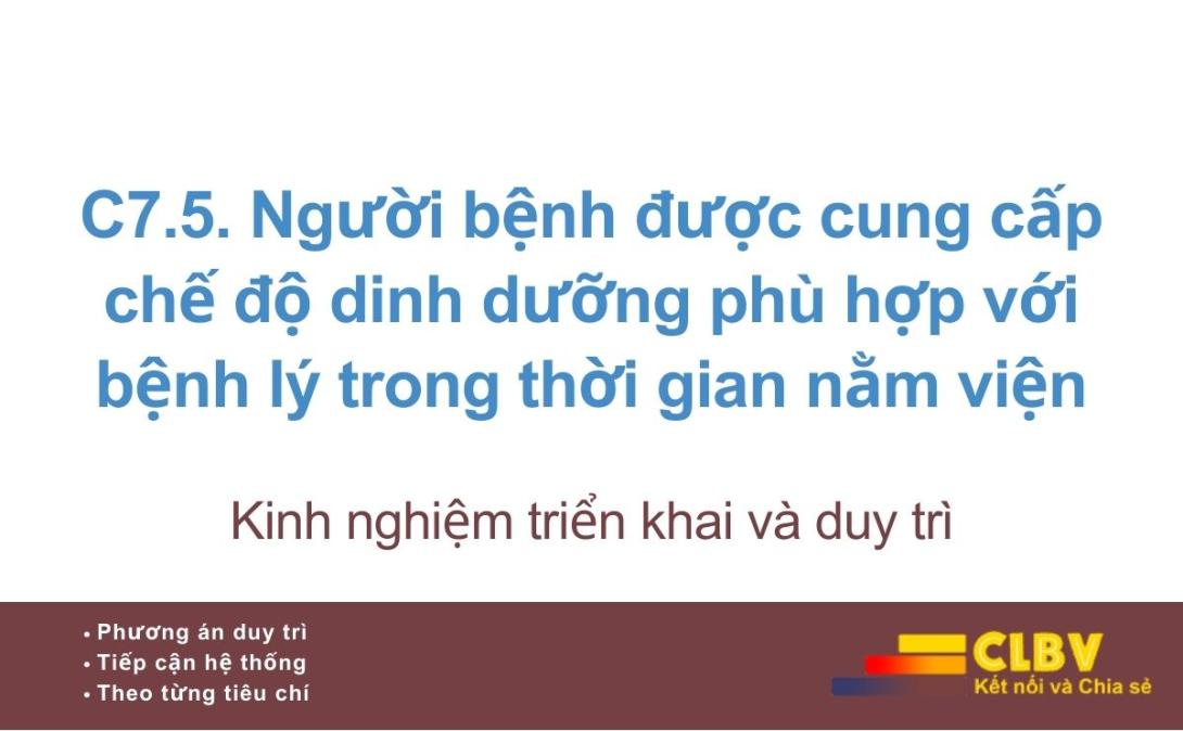 Tiêu chí C7.5 không chỉ yêu cầu bệnh viện “có suất ăn cho người bệnh”, mà yêu cầu người bệnh thực sự được cung cấp chế độ dinh dưỡng phù hợp với bệnh lý, tình trạng bệnh và chỉ định điều trị trong suốt thời gian nằm viện.