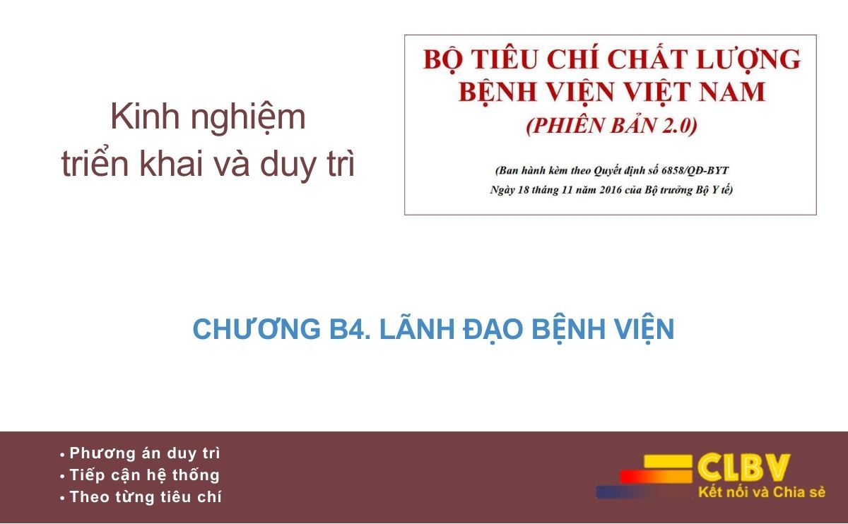 Chương B4 cũng có mối liên hệ chặt chẽ với các nội dung về quản trị chất lượng, an toàn người bệnh và văn hóa tổ chức. Một lãnh đạo bệnh viện có năng lực và cam kết sẽ tạo ra môi trường khuyến khích nhân viên báo cáo sự cố, tham gia cải tiến chất lượng và phát triển nghề nghiệp, từ đó nâng cao chất lượng chăm sóc người bệnh một cách toàn diện.
