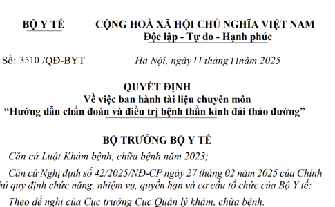 Quyết định 3510/QĐ-BYT năm 2025 về Tài liệu chuyên môn “Hướng dẫn chẩn đoán và điều trị bệnh thần kinh đái tháo đường” do Bộ trưởng Bộ Y tế ban hànhBan hành kèm theo Quyết định này tài liệu chuyên môn “Hướng dẫn chẩn đoán và điều trị bệnh thần kinh đái tháo đường”.