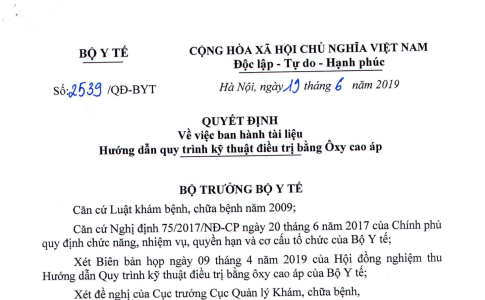 Quyết định 2539/QĐ-BYT năm 2019 về tài liệu Hướng dẫn quy trình kỹ thuật điều trị bằng Ôxy cao áp do Bộ trưởng Bộ Y tế ban hành