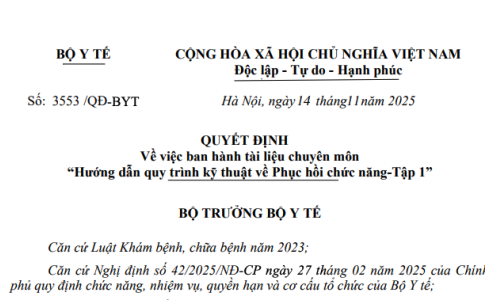 Quyết định 3553/QĐ-BYT năm 2025 về Tài liệu chuyên môn “Hướng dẫn quy trình kỹ thuật về Phục hồi chức năng - Tập 1” do Bộ trưởng Bộ Y tế ban hành