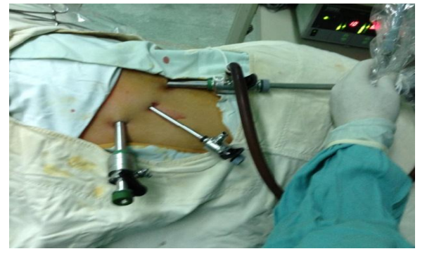 - Vị trí đặt trocar: đặt ba trocar dọc theo bờ sườn phải.