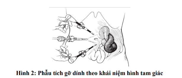 - Tiếp theo là bơm hơi và dùng ống kính camera để quan sát đánh giá ổ bụng và đặt các lỗ trocar tiếp theo. Thường trocar số hai lựa chọn cho tay phải của phẫu thuật viên và phẫu thuật viên đứng đối diện với khu vực bụng trướng nhất. Sau khi có được trocar thứ hai thì có thể dùng kéo để phẫu tích, đây là một dụng cụ rất tốt trong việc gỡ dính, khi ruột quá dính vào thành bụng có thể phẫu tích sâu vào thành bụng để hạn chế tổn thương thanh cơ của ruột. Một khi đã đặt được hai trocar thì có thể tiến hành gỡ dính các tạng khỏi thành bụng. Sau đó đặt trocar thứ ba theo nguyên lý tam giác, đây là lỗ trocar để dùng dụng cụ kẹp nâng ruột để thực hiện gỡ dính. Tuy nhiên số lượng trocar và vị trí phải dựa vào tình trạng bệnh lý trong ổ bụng và di chuyển camera giữa các trocar để có thể nhìn thấy rõ nhất.