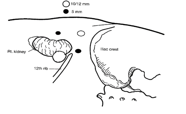 - Vào khoang sau phúc mạc bằng 3 trocar (2 trocar 5mm, 1 trocar 10mm) hoặc 2 trocar (1 trocar 10mm, 1 trocar 5mm).