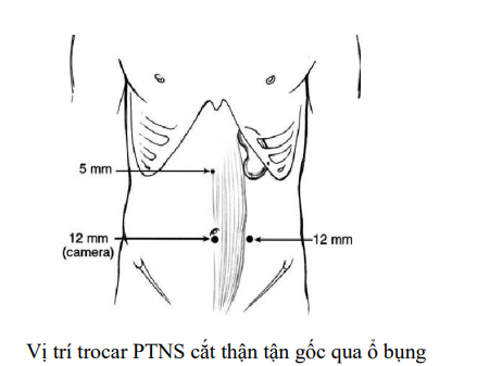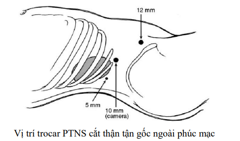Vị trí trocar: 1 trocar 12mm vùng rốn, 1 trocar 12mm ngang rốn nằm ngoài cơ thẳng bụng và 1 trocar 5mm nằm giữa mũi ức và rốn. Vị trí trocar PTNS cắt thận tận gốc qua ổ bụng.