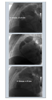 - Đưa bóng nong đến buồng nhĩ phải dựa trên wire vòng, đưa bóng nong qua lỗ van động mạch phổi, bơm bóng nong từng bước để tách mép van động mạch phổi.