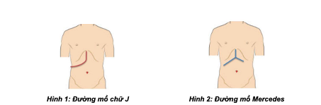 BƯỚC 1 - mở bụng: tùy theo kích thước thương tổn mà có thể lựa chọn các đường mổ như: Đường trắng giữa trên dưới rốn, đường dưới sườn mở rộng lên mũi ức (đường Mercedes) hoặc đường chữ J bên phải.