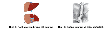 - Cặp kiểm soát chọn lọc động mạch gan và tĩnh mạch cửa trái theo một trong hai phương pháp trên sẽ thấy đường ranh giới giữa phần gan thiếu máu và không thiếu máu chính là đường cắt gan.. Mặt trên gan đường cắt theo rãnh giữa(thường từ bờ trái tĩnh mạch chủ dưới đến điểm giữa giường túi mật). Ở mặt dưới gan đường cắt cũng xuất phát ở giữa giường túi mật đi về phía bờ phải đáy dây chằng tròn. Dùng dao điện rạch mở vào bao glisson, đánh dấu đường cắt gan trái.