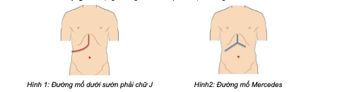 BƯỚC 1 - mở bụng: tùy theo thương tổn, chủ yếu mở đường dưới sườn mở rộng lên mũi ức hoặc đường chữ J. Trong một số trường hợp u nhỏ, người bệnh gầy thì có thể mở đường trắng giữa trên dưới rốn.