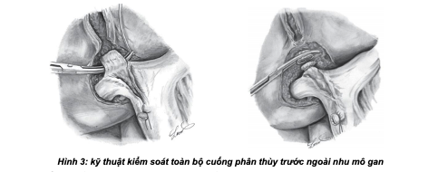 - Kiểm soát cuống phân thùy trước: có thể phẫu tích từng thành phần cuống gồm đm phân thùy trước (tách ra từ đm gan phải) và tĩnh mạch cửa phân thùy trước; hoặc kiểm soát cả cuống phân thùy trước bằng cách tách nhẹ nhu mô gan khỏi cuống Glisson phân thùy trước (thường bằng kéo đầu tù) rồi luồn lắc qua cuống phân thùy trước.
