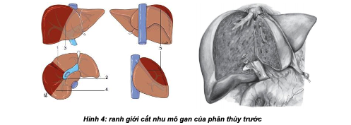 - Xác định diện cắt gan: cặp cuống phân thùy trước xác định đường thiếu máu, trường hợp đường thiếu máu không rõ có thể sử dụng siêu âm trong mổ để xác định đường đi của tĩnh mạch gan phải và tĩnh mạch gan giữa. Diện cắt gan sẽ nằm bên trái tĩnh mạch gan phải và bên phải tĩnh mạch gan giữa.