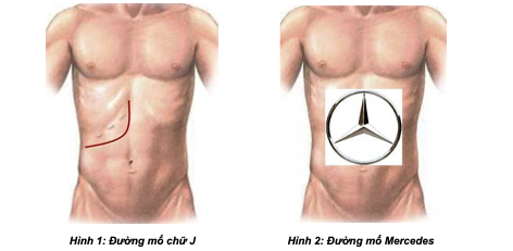 BƯỚC 1 - mở bụng: tùy theo thương tổn, chủ yếu mở đường dưới sườn mở rộng lên mũi ức hoặc đường chữ J, hoặc đường trắng giữa trên dưới rốn