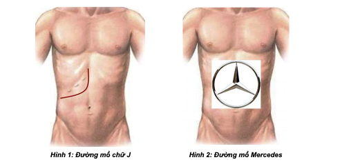 BƯỚC 1 - mở bụng: tùy theo thương tổn, chủ yếu mở đường dưới sườn mở rộng lên mũi ức hoặc đường chữ J.
