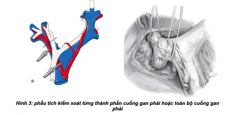 - Kiểm soát cuống gan phải: có thể phẫu tích từng thành phần cuống gan phải gồm đm gan phải và tĩnh mạch cửa phải; hoặc kiểm soát cả cuống gan phải bằng cách tách nhẹ nhu mô gan khỏi cuống Glisson ở ngã ba (thường bằng kéo đầu tù) rồi luồn lắc qua cuống gan phải.