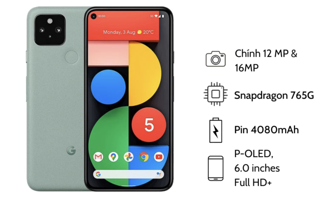 Google Pixel 5 là chiếc smartphone ra mắt vào năm 2020, được thiết kế với mục đích phục vụ cả công việc và giải trí. Máy sử dụng vi xử lý Snapdragon 765G, RAM 8GB và bộ nhớ trong 128GB. Mặc dù không sở hữu thông số phần cứng vượt trội như các đối thủ cao cấp, Pixel 5 vẫn được đánh giá cao nhờ sự tối ưu hóa phần mềm, đặc biệt ở camera.