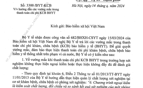 Công văn 3300/BYT-KCB năm 2024 hướng dẫn vướng mắc trong thanh toán chi phí khám chữa bệnh bảo hiểm y tế do Bộ Y tế ban hành