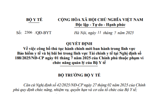 Quyết định 2306/QĐ-BYT năm 2025 công bố thủ tục hành chính mới trong lĩnh vực Bảo hiểm y tế và bị bãi bỏ trong lĩnh vực Tài chính y tế tại Nghị định 188/2025/NĐ-CP thuộc phạm vi chức năng quản lý của Bộ Y tế