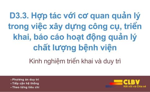 Tiêu chí D3.3 là bước hoàn thiện cuối cùng của chu trình cải tiến chất lượng, thể hiện mối quan hệ giữa bệnh viện và cơ quan quản lý nhà nước không chỉ dừng ở “kiểm tra – giám sát”, mà tiến tới hợp tác – hỗ trợ – cùng cải tiến chất lượng.