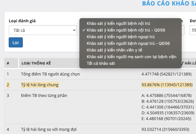 Lưu ý, cách tính Tỷ lệ hài lòng người bệnh đang được tính theo Cách thứ 2 trong hướng dẫn đính kèm QĐ 56.