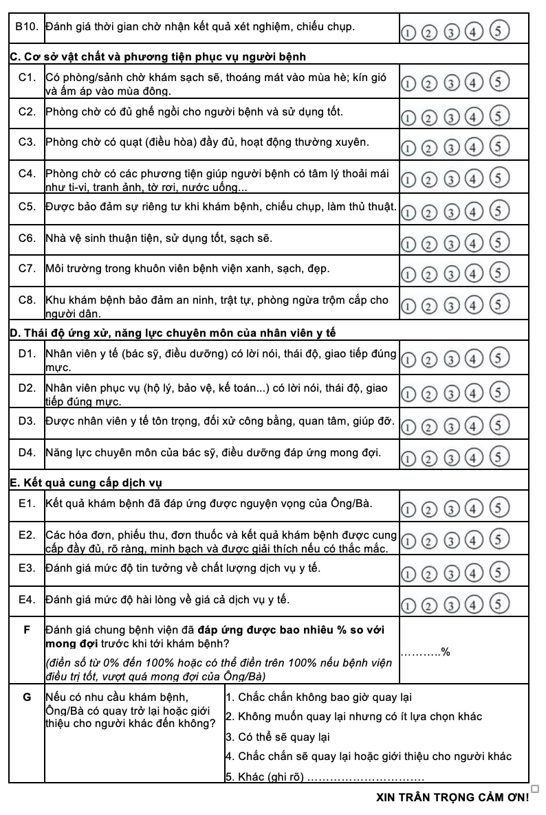 E. Kết quả dịch vụ: Kết quả khám, minh bạch tài chính, sự tin tưởng, giá cả.