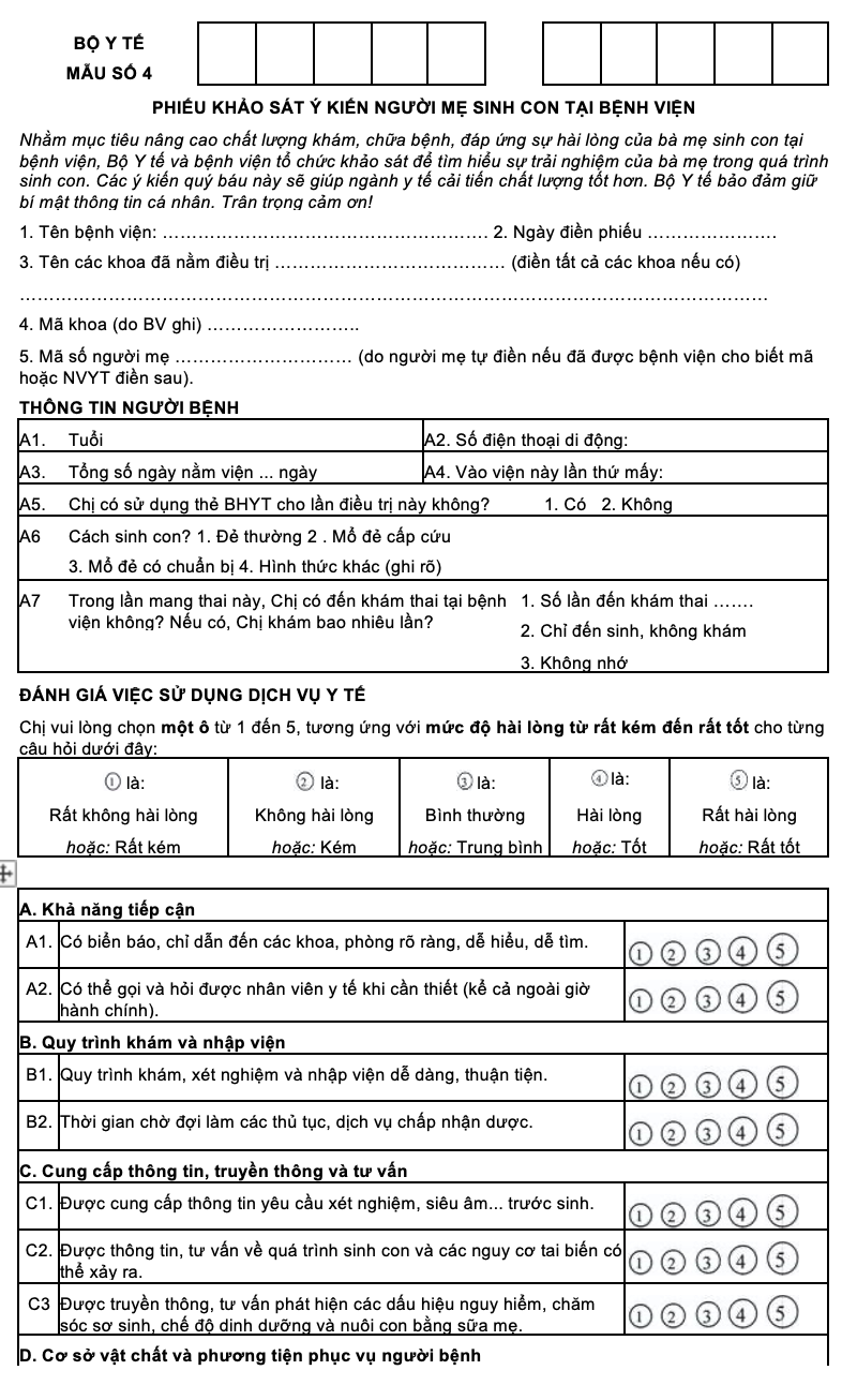Nhằm không ngừng nâng cao chất lượng chăm sóc sản phụ và trải nghiệm sinh con tại bệnh viện, Bộ Y tế ban hành Mẫu số 4 – Phiếu khảo sát ý kiến của người mẹ sinh con tại bệnh viện. Đây là công cụ đánh giá chuyên biệt, tập trung vào các yếu tố ảnh hưởng đến sức khỏe, tâm lý và sự hài lòng của bà mẹ trong suốt quá trình nằm viện.