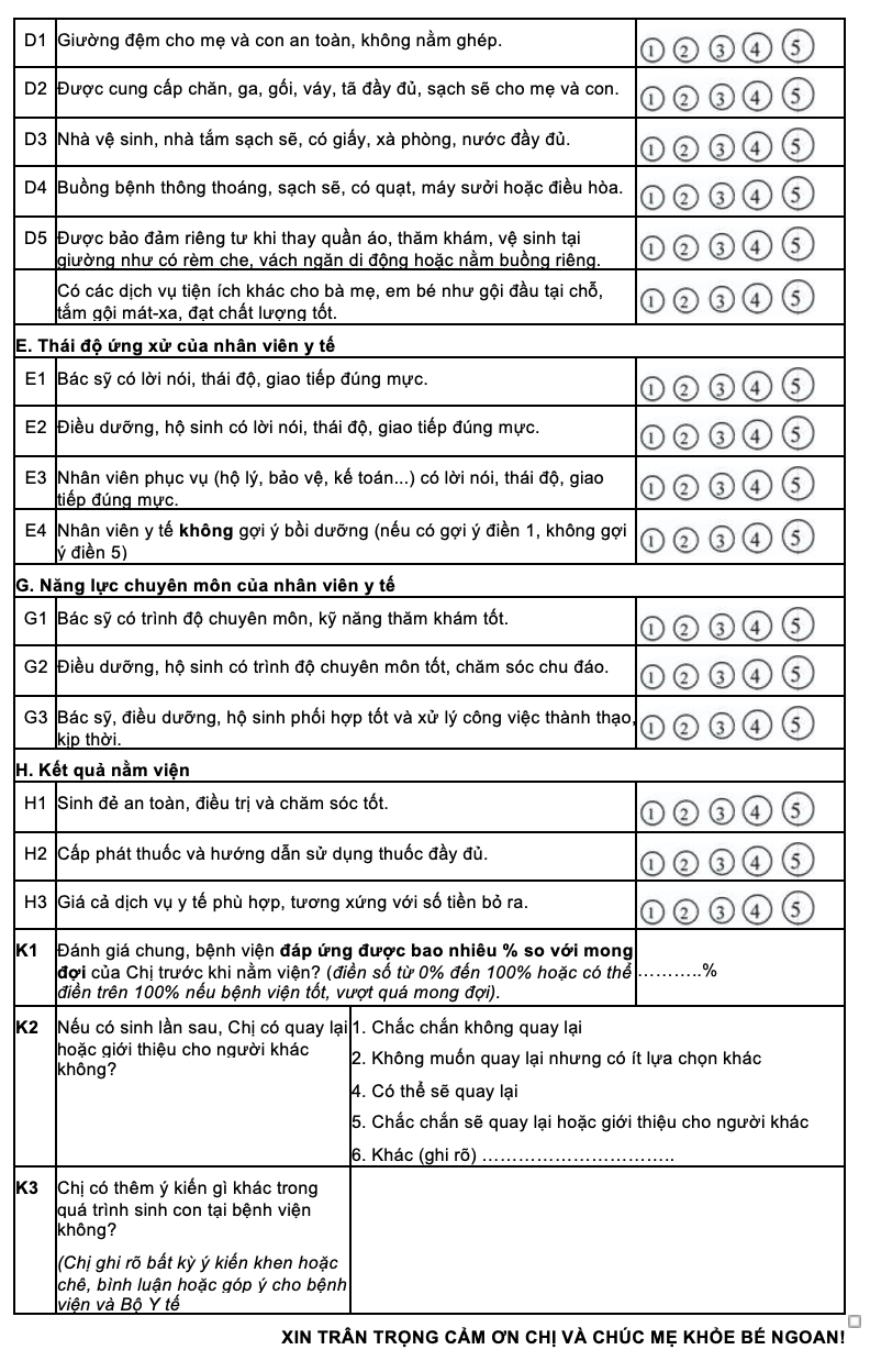 Mẫu phiếu số 4 là bước tiến quan trọng trong việc chuẩn hóa khảo sát theo nhóm đối tượng đặc thù. Qua đó, các bệnh viện có thể cải tiến dịch vụ một cách sâu sát, cụ thể và hướng đến mô hình chăm sóc thai sản toàn diện, thân thiện và an toàn cho mẹ và bé.