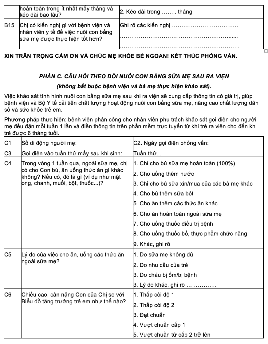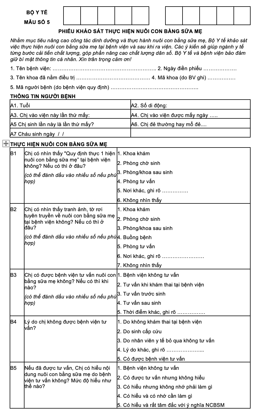 Nuôi con bằng sữa mẹ là một trong những yếu tố then chốt giúp cải thiện sức khỏe trẻ sơ sinh và nâng cao chất lượng dân số. Nhằm thúc đẩy thực hành nuôi con bằng sữa mẹ tại bệnh viện và sau khi xuất viện, Bộ Y tế ban hành Mẫu số 5 – Phiếu khảo sát thực hiện nuôi con bằng sữa mẹ, thu thập ý kiến từ các bà mẹ trực tiếp trải nghiệm.